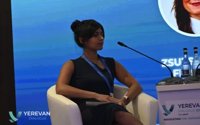 The panel titled “Dual-Use Technologies: Navigating the Ethics and Security of Military Innovation” brought together experts to discuss the increasingly blurred lines between civilian and military technologies and the urgent need for ethical and regulatory frameworks. Panelists included Aram Jivanyan (Chairman of Military Industrial Committee, Armenia), Satoru Nagao (Fellow, Hudson Institute, Japan), Urmi Tat (US-India ORF AI Fellow, India), and Zsuzsa Anna Ferenczy (Assistant Professor, National Dong Hwa University, Taiwan). The session was moderated by Leonid Nersisyan (Senior Research Fellow, Applied Policy Research Institute, Armenia).