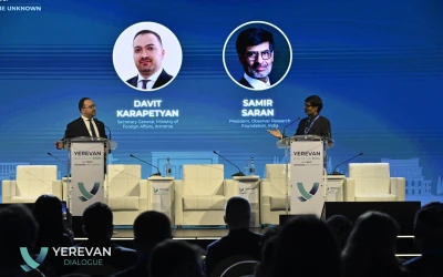 Davit Karapetyan, Secretary General of the Ministry of Foreign Affairs of Armenia, and Samir Saran, President of the Observer Research Foundation (India), engaged in a forward-looking discussion on climate, connectivity, artificial intelligence, and the future of global cooperation.